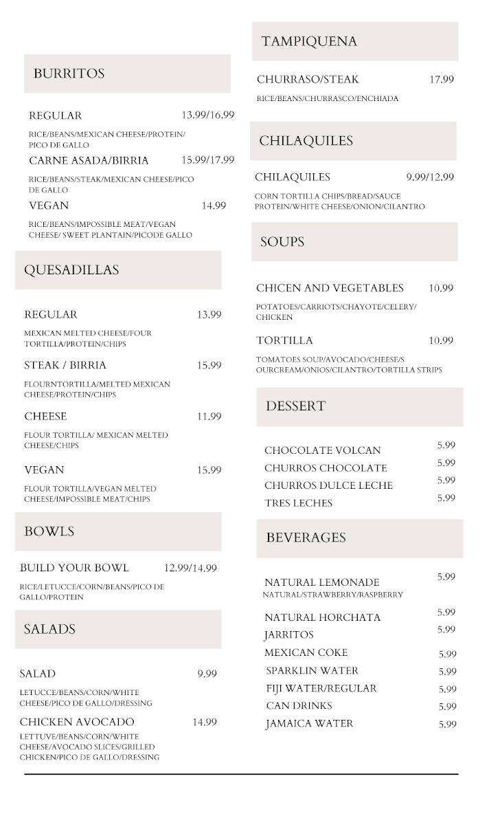 Churrasco steak served with mexican rice, refried beans, one chicken tinga enchiladas served in your favorite sauce and a side of guacamole.